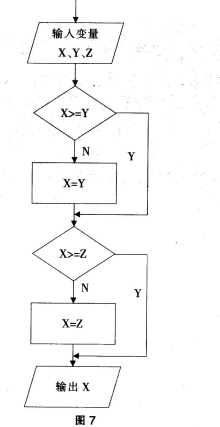 解析 本程序的执行过程为:首先输入三个数X,Y,Z;然后X与Y进行比较,如果X>=Y成立,则向后执行,否则,将Y赋值给X,此时X中存放X与Y中的大数;再次X与Z进行比较,如果X>=Z,则直接输出最大数X,否则,将Z赋值给X,此时X存放X、Y、Z中的最大数,输出X,即最大数。