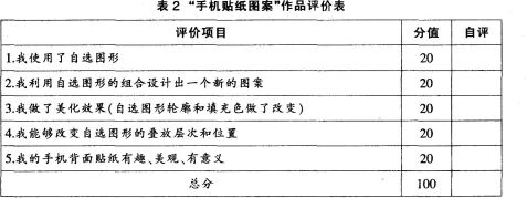 问题 案例: 阅读下列教学片段,回答问题。 夏老师教授的“标志的设计与制作”这节课主要内容是利用Word中的自选图形绘制图形并美化修饰。本节课涉及的内容包括“插入自选图形、几个自选图形的组合、自选图形的轮廓和颜色设置、自选图形的叠放次序”。 围绕着这节课的教学目标.考虑到学习任务的实用性与趣味性,夏老师设计了“手机贴纸图案” 这一学习任务请同学们完成。任务完成后,夏老师给出了“手机贴纸图案”作品评价表(如表2)。 对照着评价表,同学们开始给自己的作品打分,夏老师发现小阳和小亮的作品(见图14)水平差别很大,但按照这个评价表,他们都给了自己满分。 问题: (1)结合小阳和小亮的自评结果,你认为此评价表存在什么问题 (2)请你对作品评价表提出修改的建议。