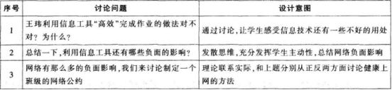 解析 (1) (2)教师讲述王玮利用信息技术和资源,作弊提前完成暑假作业的案例。让学生通过案例进行分析展开讨论以下问题: 王玮利用信息工具“高效”完成作业的做法对不对为什么 在学生讨论中,多数学生都会意识到,利用信息技术虽然更加高效,但是不能够达到利用作业巩固知识的目的,虽然完成了作业,但是该学会的知识没有学会,应该练习的题目没有练习,所以这个做法是不正确的。 教师总结,信息技术给我们带来了很多方便,但是也会给我们带来一些问题。我们小组内部可以利用桌上的电脑,表演各位同学使用网络时间方面,网络内容方面,对待信息的态度方面,个别信息对我们的具体影响等方面,来进行总结讨论,在生活中,我们的信息技术还给我们带来了什么负面的影响。各小组的学生演示在家庭中使用电脑的一些实际经历和真实感受,总结出相关的负面信息,比如:网瘾、网络孤独和自闭、道德价值观偏差等问题。理论联系实际。 教师总结网络的负面影响,面对网络的负面影响,我们应该如何上网,小组讨论班级上网公约。讨论结束之后,可以和《全国青少年网络文明公约》做对比,从而能够理解网络文明公约并且遵守网络文明公约。