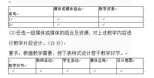 问题 请阅读下列材料: 本节课的教学任务中包含了“计算机硬件系统”的内容。该内容的主要学习目标是:(1)能够说出计算机硬件系统的组成及功能;(2)正确描述计算机硬件系统的组装过程,初一年级学生在小学阶段对该内容已经有了初步的了解,能说出计算机硬件的主要组成部分。 教学方法:讲授法 教学对象:初中一年级学生 教学环境:普通教室 教学用时:15分钟 根据上述材料。完成下列任务: (1)请为上述教学内容设计一个板书。(10分) 要求:板书类型和内容有利于学生梳理和归纳计算机系统的组成及硬件功能。 (2)请根据教学需要,选择两组合适的媒体或媒体组合,并说明与其相适应的教学资源。
