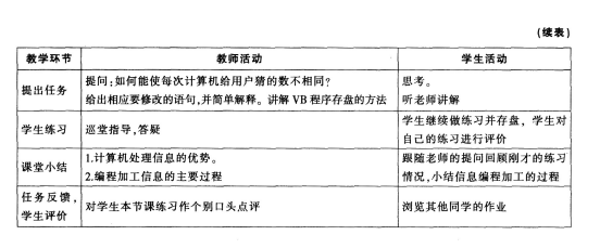 问题 请阅读下列材料: 《信息的编程加工》是教育科学出版社高中信息技术教材必修第三章第二节的知识。本节内容是上一节《信息加工的概述》的承接。通过上一节课学生们知道了信息加工的重要性、信息加工的过程、信息加工的类型。其中第一种类型就是“基于程序设计自动化信息加工”(在上一节课讲到这个位置的时候,把悬念留给学生)。 教学重点难点 ①重点:编程加工信息的主要过程: ②难点:使用VB输入代码,调试程序。 依据上述材料。完成下列任务: (1)确定本节课的教学目标。(10分) (2)对本节课进行教学策略分析。(10分) (3)请为本节课设计教与学的活动。(15分)