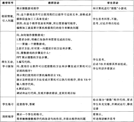 问题 请阅读下列材料: 《信息的编程加工》是教育科学出版社高中信息技术教材必修第三章第二节的知识。本节内容是上一节《信息加工的概述》的承接。通过上一节课学生们知道了信息加工的重要性、信息加工的过程、信息加工的类型。其中第一种类型就是“基于程序设计自动化信息加工”(在上一节课讲到这个位置的时候,把悬念留给学生)。 教学重点难点 ①重点:编程加工信息的主要过程: ②难点:使用VB输入代码,调试程序。 依据上述材料。完成下列任务: (1)确定本节课的教学目标。 (2)对本节课进行教学策略分析。 (3)请为本节课设计教与学的活动。