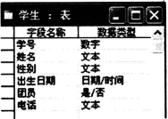 问题 方方用Access软件建立了“学生”数据表,表结构如图所示,该数据表结构中存在1处数据类型错误,其字段名称是()。