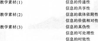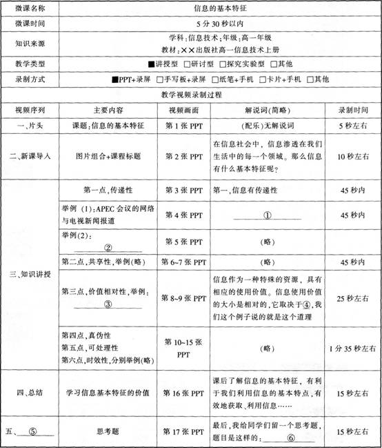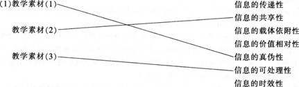 问题 请阅读下列材料: 近年来.一些中学信息技术老师开始尝试使用微课来辅助学生的信息技术学习。微课是围绕某一个教学知识点.以教学视频为表现形式的微型课程。下面是某教师关于“信息的基本特征”微课的教学设计,主要过程是教师围绕“信息的基本特征”这个知识点进行讲解、举例,并布置任务。 教学内容:信息的基本特征。 教学对象:高一学生.已经学习了信息和信息社会的相关内容。 教学目标: (1)知道信息的基本特征。 (2)能够举例说明信息的基本特征。 部分教学素材: (1)《三国演义》中的“空城计”故事。 (2)英国文学家萧伯纳:“你有一个苹果,我有一个苹果,我们彼此交换,每人还是一个苹果。你有一个思想,我有一个思想,我们彼此交换,每人有两个思想。” (3)相传某年春节期间郑板桥路过一户人家,门上写着一副对联,上联是“二三四五”,下联是“六七八九”,横批是“南北”,很多过路人看了不解其意,只有郑板桥明白了这户人家“缺衣少食,缺少东西”,随后亲自送去了年货。 根据上述材料,完成下列教学设计任务。(要在答题卡上作答,在试卷上作答无效) (1)请将下列教学素材与教学内容用连线进行匹配。(12分) (2)请结合教学设计,将下列微课制作脚本补充完整。(23分)