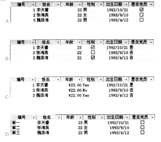 解析 B项当中的性别应是文本类型,不应是是/否类型;C项年龄应是数字类型,不应是货币类型;D项编号应是自动编号的,不应是文本类型。
