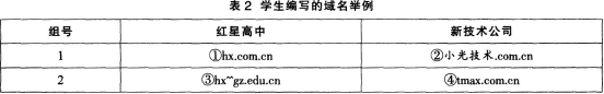 问题 案例: 以下是章老师的《域名与域名的管理》一课的教学片段。 章老师首先介绍了域名的含义和作用,然后给出表1,让学生找规律,探索域名的构成及命名规则。 学生发表各自的看法,用时5分钟。 之后教师总结如下: (1)域名基本结构就是一个层级结构,层间用“.”分开,顶级域名在后,次级域名依次向前。 (2)域名命名规则:(略)。 接着。章老师引导学生以小组讨论的方式做了一个“编名字”的小游戏。 小组讨论.完成以下任务: ①给一所新学校“红星高中”编写域名; ②给父母或亲戚开的一家新技术公司编写域名。 章老师将学生编写的域名记录下来(如表2),并引导学生参照教材中的域名命名规则进行点评。 问题: (1)请分析章老师设计“编名字”小游戏的意图。 (2)如果你是章老师,请编写一段教师语言对表2中的域名进行点评。