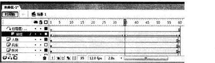 问题 使用Flash软件制作“轻轻松松去春游”动画,时间轴如图所示,其中隐藏的图层是( );制作补间动画的图层是( )。