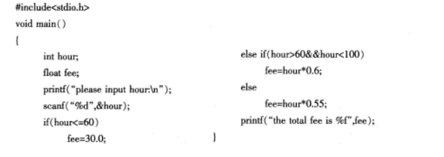 问题 某小区的网费是按照每个月的上网时数计算的,若每月上网时间小于等于60小时,则网费为30元;若每月上网时间为60~100小时,每小时网费为0.6元;若每月上网时间大于等于100小时,每小时网费为0.55元。要求输入每月上网小时数时,显示该月总的上网费用。
