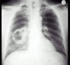 男,54岁,咳嗽,伴胸痛两周,午后有低热,出汗较以前增多,胸片如图,最可能的诊断是 ( )A、肺癌B、肺大疱C、结核空洞D、韦格氏肉芽肿 ...