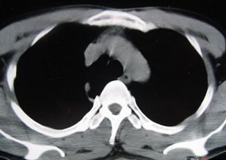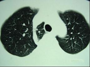 男,40岁,CT检查如图,最可能的诊断为 ( )A、右上肺占位B、右上肺奇叶形成C、右上肺陈旧性结核灶D、右上肺不张E、右上肺纤维化