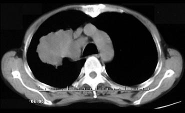 选项 A、右上肺中央型肺癌并右上肺不张,纵隔淋巴转移 B、右上肺周围型肺癌并纵隔淋巴转移 C、右上肺肉瘤并纵隔淋巴转移 D、右上肺不张 E、右上肺硬化性血管瘤