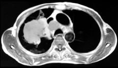 男,68岁,右侧胸痛伴右上臂麻木一周,胸部CT、MRI扫描如图,最可能的诊断为 ( )A、右上肺中央型肺癌并右上肺不张,纵隔淋巴转移B...