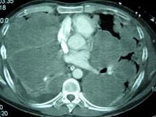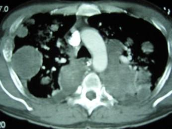 问题 33岁,男,咳嗽1周,有骨肉瘤病史,请结合胸片和CT选出最可能的诊断 ( )