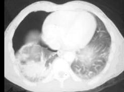男,31岁,车祸后10小时余,请结合影像学检查,选出最可能的诊断 ( )A、矽肺B、大叶性肺炎C、肺结核D、气胸伴肺挫伤E、肺癌
