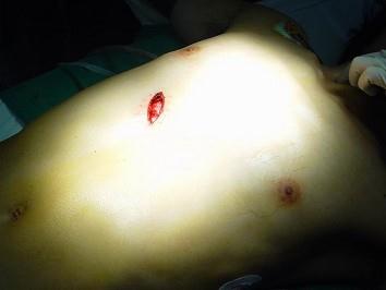 男性,36岁,右前胸部刀刺伤后1小时来就诊,胸片如图,体查:神清,血压10.7/6.7kPa(80/50mmHg),心律130次/分,呼吸极度困难,发绀,...