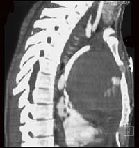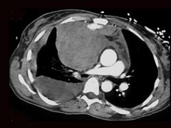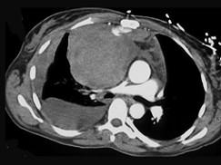 男,33岁,右胸部外伤,胸闷、气短,结合CT图像,最可能的诊断是 ( )A、淋巴管瘤B、淋巴瘤C、纵隔血肿D、畸胎瘤E、胸腺瘤