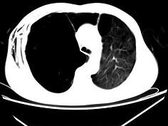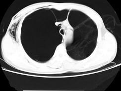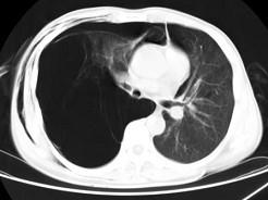 男,32岁,被车撞伤后1小时,请结合影像图像选择其最可能的诊断为 ( )A、右侧肺大疱并皮下纵隔气肿B、支气管断裂C、右肺不张...