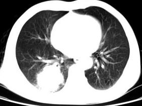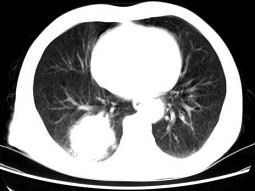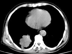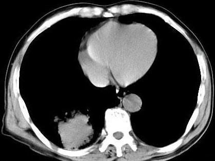 男,66岁,胸痛一月,胸部CT如图,最可能的诊断是 ( )A、右下肺错构瘤B、右侧炎性假瘤C、右下肺动静脉瘘D、右下肺肉瘤...