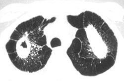 男,68岁,呼吸困难,发绀,咯血1周,有40余年采矿史,请结合CT检查选择最可能的诊断 ( )A、肺脓肿B、支气管扩张C、矽肺D、肺癌...