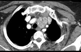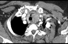 问题 40岁,女,发现颈部肿块,随吞咽上下移动,触之无搏动,咳嗽、气喘一周,请结合CT图。检查选择最可能的诊断 ( )