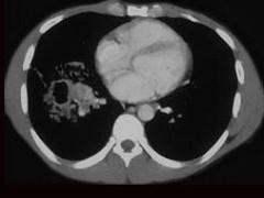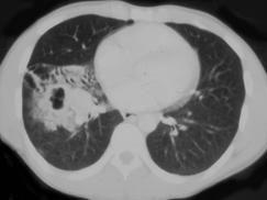 男,42岁,高热,寒战,咳嗽,胸痛1周左右,CT检查如图,选择最可能的诊断 ( )A、肺脓肿B、肺转移瘤C、肺癌D、肺囊肿E、肺结核