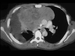 女,34岁,咳嗽,咯血半月余,请结合影像学检查,选出最可能的诊断 ( )A、神经源性肿瘤B、肺癌C、淋巴瘤D、胸腺瘤E、纵隔畸胎瘤