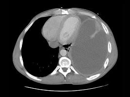 43岁,男,持续高热一周,呼吸急促,胸痛,CT和胸片检查如图,请选出最可能的诊断 ( )A、肺气肿B、胸膜间皮瘤C、肺脓肿D、气胸...