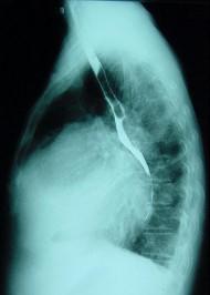 对如下心脏左侧位片描述正确的是 ( )A、正常心脏B、以上均错C、左心房Ⅰ度增大D、左心房Ⅲ度增大E、右心房增大