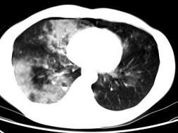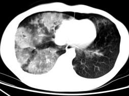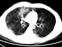 男,28岁,外伤后1小时行胸部CT如图,其最可能的诊断为 ( )A、肺癌B、双肺挫伤C、肺脓肿D、肺囊肿E、肺炎