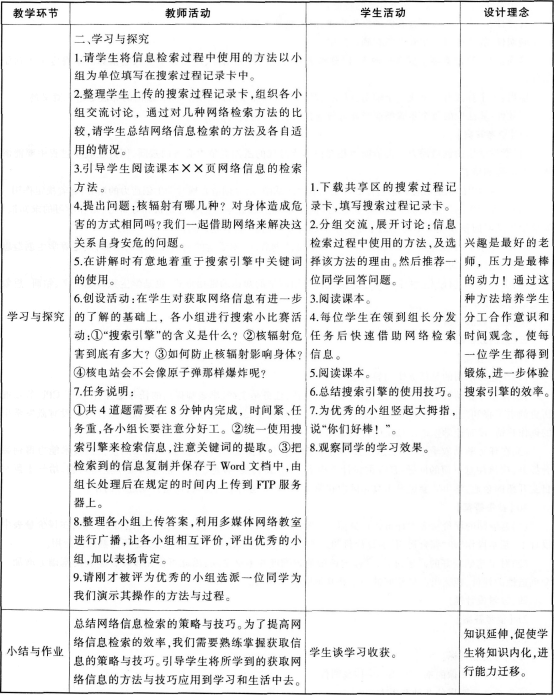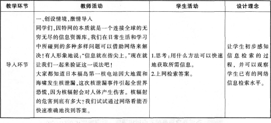 解析 (1)教学目标: 知识与技能目标:学生借助网络能够检索自己想获取的信息,体验和掌握网络信息检索的方法和搜索引擎的使用技巧。 过程与方法目标:学生通过合作探究,提升合作学习的意识和能力,能够使用搜索引擎准确快速地找到自己需要的信息。 情感态度与价值观目标:能够借助网络解决日常生活和学习中所碰到的问题,感受到学习信息技术的乐趣。 教学重点:掌握网络信息检索的方法和搜索引擎的使用技巧。 教学难点:掌握关键词搜索的技巧。 (2)① 任务驱动法:在教学中教师依据教学内容,确定任务。使学生明确任务后,教师设置目标,多留给学生尝试的时间和空间,引导学生自主地探索,发现与主题相关的 知识,充分体现了以学生为主体的教育模式。请学生将信息检索过程中使用的方法以小组为单位填写在搜索过程记录卡中。 ②讨论法:所谓小组讨论法就是在教师的指导下,小组成员围绕某个问题发表各自的意见,通过互相讨论、辩论,对问题获得新的理解和认识、形成个人见解的一种教学方法。比如本教学设计中学生分组讨论信息检索的方法和选择该方法的理由。 ③ 创设情境法:信息技术课堂教学过程中创设各种情境,激发学生的主动性和创造性,使课堂在情境中有机拓展、学生情感在情境中体验、教学效果在情境中不断提 升。导人时候创设情境,日本福岛第一核电站因大地震和海啸发生核泄漏,这次核泄漏事件引起全世界恐慌,因为核辐射会对人体产生伤害。核辐射的危害到底有多 大 ④分层教学法:强调适应学生的个别差异,着眼使各个层次学生都能在各自原有的基础上得到较好发展。 即在共同的教育目标下根据学生个体的差异把学生分层,采取不同的教学方法,使各个层次的学生向高层次进行递进的教学。 (3)