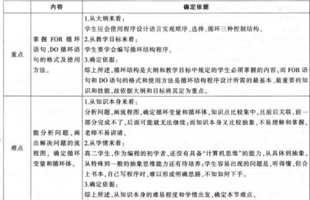 问题 计算机是按照人们设定程序运行的.其中有一种程序是在指定条件下重复执行固定的语句块,这样的程序被称为循环程序。比如要求用计算机计算1+2+3+…+98+99+100的和,就需要我们设计一个循环程序。 实现循环程序的设计和编写.需要学习的内容包括:算法的概念与特征、一种描述算法的方法、算法设计的方法、变量、常量、相关的运算符、运算规则、表达式、赋值运算、输入输出语句等知识、函数的构造、实现循环程序的具体循环语句(FOR循环语句、D0循环语句),直至学会编写循环结构程序. 教学方法:讲授教学法 教学对象:高中二年级学生 教学环境:多媒体教室 教学用时:2课时(90分钟) 综合上述材料.完成下列任务: (1)描述本单元学习的层级关系,或者画出本单元学习内容的层级关系图。(15分) (2)分析本单元的教学重点和教学难点。(20分)