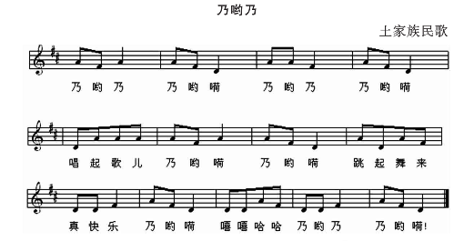 解析 (1)《乃哟乃》是一首土家族的歌曲,表现了土家儿童幸福、快乐的生活。 (2)全曲只用了do、mi、sol三个音谱成,其旋律多为级进下行,极富民族风格和地方色彩,给人以奇特、质朴、清新之感。 (3)是一个让孩子们了解土家族,拓宽民族音乐文化的很好的载体。 (1)知识目标:能用活泼优美的声音,准确地演唱歌曲《乃哟乃》。能认唱音符do、mi、sol。 (2)能力目标:能用碗筷和老师合作演奏歌曲《乃哟乃》,在音乐活动中培养团结合作的精神。 (3)情感目标:了解土家风情,感受土家族音乐特点,并对土家族歌舞产生兴趣。 音乐律动导入,用音乐营造幸福快乐的氛围: 学生随着歌曲《幸福拍手歌》的伴奏音乐,自由而有序地进入音乐课堂; 1.师生问好; 2.教师提问导入:什么是幸福?你们觉得怎样就是幸福?哪位小朋友来说给老师听听? 学生:被爸爸妈妈喜欢就是幸福,被老师喜欢就是幸福,开开心心就是幸福,一家人住在一起就是幸福...... 3.教师:小朋友们说得真好!幸福和快乐常常在一起,我们会因为幸福而快乐,也会因为快乐而幸福。你们都觉得幸福吗?那我们一起来唱首《幸福拍手歌》! 教师引导学生边哼唱《幸福拍手歌》,边做律动(拍手、跺脚、搭肩、握手) 4.教师谈话式语言引入新课:我们感到幸福的时候会用拍手、跺脚等方式表达快乐的心情。你们知道少数民族的小朋友感到幸福时是怎样表达的吗?那好,我们今天就来学习这首土家族的歌曲《乃哟乃》! 设计意图: 本课的教学设计是本着“以人为本、享受音乐”的教育理念出发的,所以本课的开始没有从传统的发声练习、节奏练习入手,而是紧紧围绕“幸福生活”这一课题展开,让学生尽快融入音乐营造的幸福快乐的氛围中。 因为低年级学生活泼好动,因此设计了律动这一环节。通过律动,既让学生将身体动作融入音乐中进行体验,又通过“拍手、跺脚、搭肩、握手”等动作培养学生的节奏感。