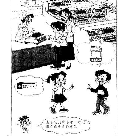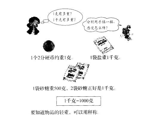 解析 1.教学目标 (1)在具体生活情境中,感受并认识质量单位克和千克。 (2)初步建立1克和1千克的观念,知道1千克=1000克。 (3)掌握用秤称量物体的方法。 (4)在建立质量观念的基础上,培养学生估量物体质量的意识。 2.教学重点 初步建立1克和1千克的观念。 问题(二): 一、创设情境,体验轻重 师:小朋友们,你们喜欢逛超市吗?老师也喜欢,昨天我在超市买了两样东西,猜一猜, 哪个更重?你怎样知道是它重?(面条和苹果) 学生可能会说用秤称,可能会说掂一掂,还可能说看标签…… 师:看来物品有轻有重,我们把物体的轻重叫作物体的质量。 二、认识秤,揭示课题 1.出示:常见的秤挂图。 师:刚才说可以用秤称,生活中有各种各样的秤,你都认识些什么秤?在哪里见过? 2.介绍一些常见的秤。東点介绍天平和盘秤。 小结:它们都可以用来称物品的质量。 3.揭示课题。 师:表示物品质量的肀位有克和下克。这节课我们就要来研究“克和千克”。(板书:克 和千克) 三、认识克,感受1克和几克 1.掂一掂1克的物品,感受1克的质量。(1个2分硬币) 师:你想知道1克是多重吗? 学生掂一掂,再闭上眼睛,感受1克的质量,你有什么感受?(很轻) 2.说一说,你觉得哪些物品也是大约1克。(药片、小发卡、纽扣、小螺丝、一粒花生、一 个兵兵球、一片树叶......) 3.掂一掂,比-比。分别掂一掂一支铅笔、一袋米、一包盐的重量,比一比谁重,感受几 克、100克、500克的重量。--般比较轻的物体我们用克做单位,用字母表示是g。 4.估一估数学课本冇多重?再称一称。(1本数学课本大约重150克) 5.介绍天平。称较轻的物品耍用到一种秤一一天平。 四、认识“千克”,感受1千克和几千克 1.感受I千克。 师:物体有轻有重,称比较轻的物体我们用克做单位,称比较重的物体时我们就用千克 做单位。那1千克有多重呢? 1扎面条的重量就是1千克,也可以用1kg表示。 师:请同学们用手掂一掂1扎面条,感受一下1千克有多重。(学生用手掂一掂) 师:你觉得1千克怎么样?(挺重)1千克就是我们平时说的2斤。但斤不是国际通用 单位。 2.说一说哪些物品大约重1千克。 3.判断千克铁和1千克棉花比较,哪个重一些? 小结:不论物体的颜色、形状、大小如何,1千克重的感觉是一样的。 4.估计几千克,称书包。 师:你估计书包有多重?你是怎样估计的?(引导学生与I千克对比) 师:好,咱们用盘秤来称一称,看你估计得准不准确。(指导学生使用盘秤) (出示盘秤)观察一下盘秤,你们有什么发现?(让学生看到指针和单位千克) 5.当我们用盘秤称东西的时候,当指针指到]就表示I千克。下面,我们就来称I千 克的东西吧。(称1千克的东西:1扎面条、1罐奶粉、两袋盐……) 6.称一称:1千克苹果有儿个? 1千克香蕉有几个? 7.活动:感受几十千克,称体重,互相抱一抱。(体重在20~35千克) 五、认识千克与克的关系 师:一包食盐有500克,两包呢? 生:1000克,因为500克加500克等于1000克。 师:再用盘秤称一称两包盐的重量。指针指向1.两包盐的重量是(1千克)。你发现了什么?(1千克等于1000克) 5千克等于多少克? 3000克等于多少千克? 六、拓展深化 1.玲玲是二年级的学生,自从学习了克和千克的认识后她对周围物体的质量可感兴趣了,下面是她称出的物体的质量,这个马大哈,把什么给漏了 .你能帮她补上吗?(课本第 89页第4题) 2.认真阅读玲玲的日记,你能发现什么? 我是一名二年级的小朋友,每天早晨,我从1千米高的床上起来,拿起重9千克的牙 刷,刷牙洗脸后,吃了一个200千克的面包,一个50千克的鸡蛋,然后背起2克的书包,穿上250千克重的鞋上学去了。 七、全课小结 你有什么收获?