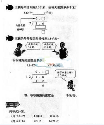 解析   教学过程   一、复习引入   计算下面各题并说一说整数除法的计算方法。 2005= 57648= 83232=引导学生回忆整数除法的计算方法:先看除数是几位,然后看被除数的前几位,前几位不够除时,多看一位,除到哪位,商就写在那位上面,不够商1,O占位。   二、创设情境   1.导入:同学们,你们喜欢锻炼吗?经常锻炼对我们的身体有益,瞧,王鹏就坚持每天晨跑,身体可棒呢!(出示情境图)让学生先说一说从图上都看到了哪些信息,然后根据图上信息提出一个数学问题。   根据学生的回答,出示已知条件和问题:王鹏坚持晨练。他计划每周跑步5.6千米,他平均每天应跑多少千米?   思路分析   2.师引导学生思考:求平均每天应跑多少千米,怎样列式? 学生列出算式:5.67。   让学生观察,这道算式和前面学习的除法相比有什么不同? 通过观察,学生会看出这道算式的被除数是小数。   3.揭题:那么被除数是小数的除法怎么计算呢?今天我们就来学习新的知识——小数除法。(板书课题:除数是整数的小数除法)   三、互动新授   1.想一想,被除数是小数该怎么除呢?   组织小组讨论。分组交流讨论情况,展示各种算法:   生1:5.6km=5600m,56007=800m.800m=0.8km。 生2:可以把小数除法转化成整数除法来计算。 生3:还可以列竖式来计算。2.师引导学生思想讨论:怎样把小数除法转化成整数除法?   2小组交流后汇报:先把被除数5.6扩大10倍,转化成567=8,   将所得的商再缩小到原来的 1/10,所以每天平均跑0.8km。   3.引导用竖式计算:如果不转化成整数除法,直接用5.67,你会怎么做?请同学们试着用竖式计算。计算完后,交流自己计算的方法。   让几名学生将自己计算的竖式在黑板上展示出来,并说说是怎样算的。 教师根据学生竖式,演示(见板书设计竖式): 根据学生的竖式追问:56表示什么? 引导学生回答:56表示56个0.1,再用56个0.1除以7就是8个0.l,5不够7除,所以要在8的前面点上小数点来表示。   4.提问:同学们观察一下,商的小数点位置与被除数小数点的位置有什么关系?(理解后回答:因为在除法算式里,除到被除数的哪一位,商就写在那一位上面,也就是说,被除数和商的相同数位是对齐了的,只要把小数点对齐,相同数位才对齐了,所以商的小数点要和被除数的小数点对齐。)   5.归纳总结:怎样计算小数除以整数? (按整数除法的方法除,计算时商的小数点要和被除数的小数点对齐。)   四、巩固拓展   完成“列竖式计算”。学生用自己喜欢的计算方法独立完成练习题,完成后组织学生集体订正,并说一说你是怎么计算的。   教师要注意学生处理商中小数点的情况,学生在写商时可能会漏掉小数点或点错小数点位置。   五、课堂小结。   这节课你们学了什么知识?有什么收获?(学生反馈)   作业: 妈妈去超市买了8样东西,共花了98.4元,平均每样东西多少钱?