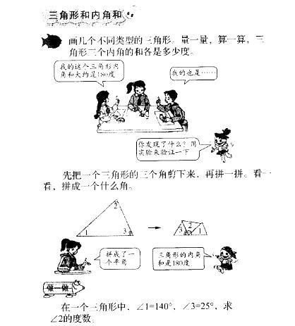 解析 【参考设计】 问题(一): 1.教学目标 (1)知识与技能目标:运用猜想验证结论的方法学习三角形的内角和,通过量、剪、拼、摆等探究活动,找到新旧知识之间的联系,验证三角形内角和是180,并运用所学知识解决简单的实际问题。 (2)过程与方法目标:通过讨论、争辩、操作、推理发展学生动手操作、观察比较和抽象概括的能力及合作学习的良好习惯。 (3)情感态度与价值观目标:渗透转化迁移思想,培养学生的发散思维,自主学习、积极探索的好习惯,严谨的科学精神,使学生体验成功的喜悦,激发学生主动学习数学、应用数学的兴趣。 2.教学重点 验证三角形的内角和为180,并利用其特点在已知两角的基础上计算未知角。 问题(二): 一、提出问题,激发学生的兴趣 出示课件,提出问题: 1*什么是三角形的内角?什么又是三角形的内角和? 2*两个大小不一样的三角形,形状大的三角形内角和比形状小的三角形的内角和大吗? 3.三个形状不一样的三角形,内角和各不相同还是相同? 二、动手操作,获取新知识 1.研究特殊=角形的内角和 师:请拿出你们的三角板量角器来(教师拿出一个三角板),说说这个三角板三个角的度数分别是多少? 生:90、60、30。(教师跟着板书) 师:这个三角形各角的度数的和是多少啊? 生:是180。 师:你是怎样知道的? 生:90 + 60 + 30=180。(教师跟着板书) 师:对,把三角形三个内角的度数加起来就叫三角形的内角和。 师:这个呢?它的内角和是多少度呢?(教师又拿出另一个三角板) 生:90 + 45 + 45=180。 师:咦,这两个三角形的内角和一样,都是180!这两个都是特殊的三角形。那么其他三角形的内角和是多少,我们来猜猜看! 生1:应该是180。。 生2:不一定。 …… 2.研究一般三角形的内角和 假设其他三角形的内角和为180,和学生讨论如何进行验证。学生提出方案并分组 进行: (1)测量三角形各个角的度数,并记录、求和、列表。 填入表格中: 让每组的学生代表说出自己设计的方案及为什么这样设计。提问学生除了班里面现有的设计方案,是否还有其他的设计方案。(锐角三角形、直角三角形、钝角三角形都要有, 这样更能说明三角形内角和的普遍性) (2)分析实验数据。 ①有的同学测得的三角形的内角和不是180,提问学生得出这样数据的原因。(误差的存在) ②得出的结果是:三角形的内角和是180。(教师板书:三角形的内角和是180) ③提问能否在以上的三角形三个角中找到大于或等于90 的角,根据数据让同学们自 己归纳有关三角形的三个内角之间的关系。 三、利用所学知识解决实际问题 1.判断题 ①一个三角形的三个内角度数是:80、75、24。( ) ②三角形越大,它的内角和就越大。( ) ③钝角三角形的两个锐角和一定小于90。( ) ④三角形的一个内角是30,如果剪去这个角,剩下的图形的内角和是150。( ) 四、课堂小结 今天你学到了哪些知识?是怎样获取这些知识的?你感觉学得怎么样?