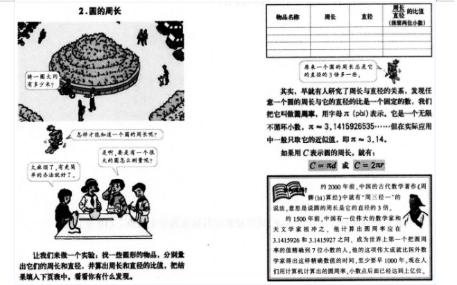 解析 (1)通过本材料教学可以促进学生知识与技能、数学思考、问题解决和情感态度四个方面的发展。 ①知识与技能:经历探索物体与圆形的形状、大小、运动和位置关系的过程,了解圆形的基本特征。 ②数学思考:在探索圆形的特征、圆形的变换以及设计图案的过程中,进一步发展空间观念。 ③问题解决:在解决问题的活动中,初步学会与他人合作。能表达解决问题的过程,并尝试解释所得的结果。 ④情感态度:体验数学与日常生活密切相关,认识到许多实际问题可以借助数学方法来解决,并可以借助数学语言来表述和交流。 (2)教学目标及重难点 教学目标: ①知识与技能目标:学生知道什么是圆的周长,理解并掌握圆周率的意义和近似值,初步理解和掌握圆的周长计算公式。能正确计算圆的周长。 ②过程与方法目标:学生能培养和发展空间观念,培养抽象概括能力和解决简单的实际问题能力;培养观察、比较、分析、综合及动手操作能力。 ③情感态度与价值观目标:通过了解祖冲之在圆周率方面所做的贡献,渗透爱国主义思想。 教学重点:理解和掌握圆的周长的计算公式。 教学难点:对圆周率的认识。 (3)新授过程设计: 一、复习正方形的周长,猜想圆的周长可能和什么有关系 1.由比较两种跑道的长短,引出它们的周长你会算吗? (如果学生谈到角或线的形状,就顺势导出:正方形是由4条这样的线段围成的,圆是由一条圆滑的曲线围成的。) 2.(生答正方形的周长)追问:你是怎么算的?(生答正方形的周长=边长*4。师板书C=4a)那你们说说正方形的周长和它的边长有什么关系?(4倍,1/4)(师,正方形的周长总是它边长的4倍,这是一个固定不变的数。) 3.圆的周长能算吗?如果知道了计算的公式能不能算?看来很有必要研究圆的周长的计算方法,下面我们就一起研究圆的周长。(板书课题:圆的周长) 4.猜想:你觉得圆的周长可能和什么有关系? 二、测量验证 1.教师提问:你能不能想出一个好办法来测量它的周长呢? ①生1:把圆放在直尺边上滚动一周,用滚动的方法测量出圆的周长。师生合作演示量教具的周长。 ②用绳子在圆上绕一周.再测量出绳子的长短,得到这个圆的周长。 2.学生动手测量.验证猜想。 (1)学生分组实验,并记下它们的周长、直径,填入书中的表格里。 (2)观察数据.对比发现。 提问:观察一下,你发现了什么呢? (圆的直径变,周长也变,而且直径越短,周长越短;直径越长,周长越长。圆的周长与它的直径有关系。) 3.比较数据.揭示关系 正方形的周长是边长的4倍.那么.圆的周长与直径之间是不是也存在着固定的倍数关系呢?猜猜看,圆的周长可能是直径的几倍? 学生动手计算:把每个圆的周长除以它的直径的商填入书中表格的第三列。 提问:这些周长与直径存在几倍的关系? 师生共同总结概括出.圆的周长总是直径的3倍多一些。 (板书:3倍多一些)到底是三倍多多少呢?引导学生看书。 三、介绍圆周率 1.师:任意一个圆的周长都是它直径的三倍多一些.这是一个固定不变的数,我们把它叫作圆周率,用字母π来表示.用手指写一写。 2.圆周率是怎样发现的,请同学们看课本小资料,讲述并对学生进行德育教育。 3.小结:早在1 500年前,祖冲之把圆周率算到了3.1415926和3.1415927之间,比外国人早了整整一千年,这是中华民族对世界数学史的巨大贡献。今天,同学们自己动手也发现了这一规律.老师相信同学们当中将来也会有成为像祖冲之一样伟大的科学家。根据需要,我们一般保留两位小数。 圆的周长总是它直径的3倍多一点。刚才我们是怎样计算的?两个数相除又可说成是两数的比。所以这个结果就是圆周长与它直径的比值。我们把圆的周长和直径的比值叫作圆周率,用字母“π”表示。这个比值是固定的,而我们现在得到的结果有差异主要是测量工具及测量方法有误差造成的。那圆周率的数值到底是多少呢?说说你知道了什么?(强调π≈3.14,在说的时候要注意是近似值,写和算的时候要按准确值计算,用等号。) 四、推导公式 1.到现在,你会计算圆的周长吗?怎样算? 2.如果用C表示圆的周长,d表示直径,字母公式怎样写?(板书:C=πd)就告诉你直径,你能求圆的周长吗?圆的周长是它直径的π倍,是一个固定不变的数。 3.知道半径.能求圆的周长吗?周长是它半径的多少倍?