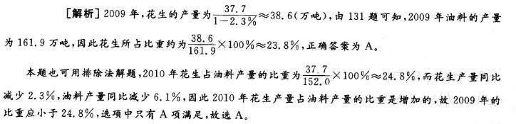问题 2010年,江苏省全年粮食总产量达3235. 1万吨,比上年增加5万吨;其中夏粮1105. 3万吨,增长0. 2%;秋粮2129. 8万吨,增长0.1%。全年粮食面积为528. 2万公顷,比上年增加1. 0万公顷;棉花面积为23. 6万公顷,减少1. 7万公顷;油料面积57. 4万公顷,减少1. 9万公顷;蔬菜面积121. 3万公顷,增加6. 5万公顷。 2010年,江苏省全年肉类总产量366. 6万吨,比上年增长6. 5%,其中猪牛羊肉产量224. 0万吨,增长4.1%;禽肉产量132. 7万砘,增长10. 2%。禽蛋总产量190.6万吨,增长2.9%。全年水产品总产量459. 5万吨,增长3. 7%,其中淡水产品324. 0万吨,海水产品135. 5万吨,分别增长3. 6%和3. 9%。 2009年,江苏省油料产量中,花生产量所占的比重约为( )。