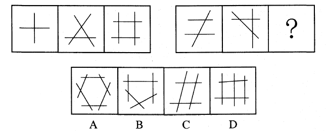 解析 第一组图形中,最后一个图形交点的个数是前两个图形交点个数之和;依此规律,后一组最后一个图形交点个数为前两个图形交点个数之和,应为5个交点。故本题选B。