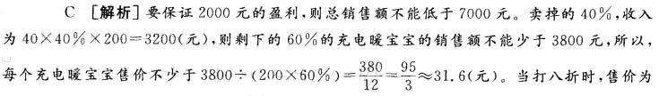 问题 寒冬来临之际,小芸花5000元买进200个充电暖宝宝,以40元单价卖出40%后,为了赶快脱手这批货,打算降价促销,问至多打几折能够保证小芸有2000元的盈利?( )