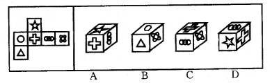 解析 A项中三个相连的圆圈必须是横排,B项右侧面的图形应该是在看不见的左侧面,C 项的顶部应该是个五角星。本题正确选项为D。