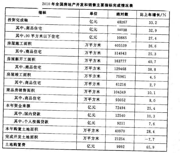 解析 2010年全国房地产投资完成额为48267亿元,其中商品住宅投资完成额为34038亿元,那么非商品住宅的投资完成额为48267-34038=14229(亿元)。2010年全国非商品住宅投资完成額约占房地产投资完成额的比重为14229/48267X100%≈14200 +/48300X100%≈29. 5%。与B选项最接近,所以,正确答案为B。