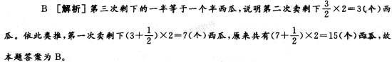 问题 老杨拉着一筐西瓜去卖,第一次卖掉了全部西瓜的一半又多半个;第二次又卖掉剩下的一半又多半个;第三次还是卖掉剩下的一半又多半个,最后老杨的筐子里还剩下1个西瓜。 老杨筐子里原来有多少个西瓜?( )