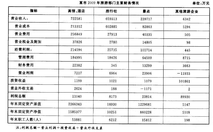 下列关于2009年该市旅游部门财务情况的描述,与资料相符的是( )。 A.营业成本占营业收入比重最高的是旅行社 B.景点的利润总额不到宾馆、酒店的...
