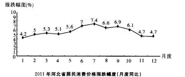 解析 由图可知,居民消费价格上涨自8月份开始回落,到底年回落了7.4-4.7 = 2. 7个百分点。正确答案为B。