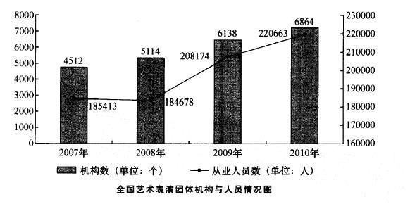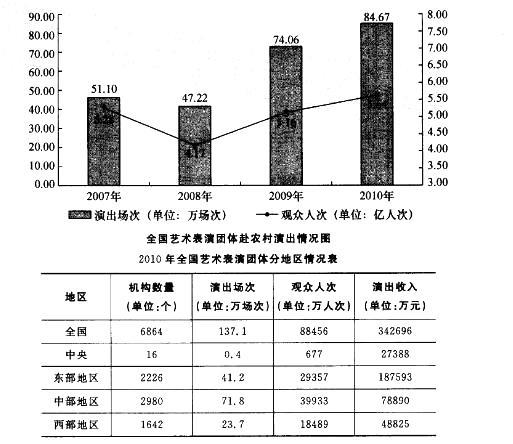 下列说法错误的是( )。 A. 2010年,平均每场次演出的观众人次最多的地区是中部 B. 2010年,东部地区的机构数量接近全国的三分之一 ...