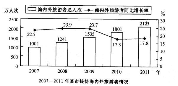 2011年,某市接待海内外旅游者2123万人次,同比增长17.8%。其中接待入境旅游者87.71万人次,同比增长8. 2%,在入境旅游者中,外国旅游者51...