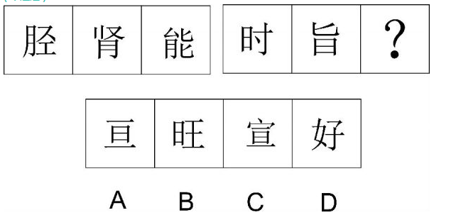 解析 本题考查求同和汉字的结构。第一段的共同部分是“月”,第二段的共同部分是“日”,在第一段中,第一个汉字是左右结构,第二个汉字是上下结构,第三个汉字是左右结构,第二段也应具有这种规律。因此,本题选择B选项。