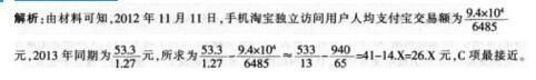 问题 2010年底登录过手机淘宝的用户数仅有1000万。2013年年底,手机淘宝的用户数突破4亿。2012年在手机淘宝的用户中。产生过购物行为的用户有5700万,每小时通过手机淘宝卖出的商品超过22万件;平均每天有928万人在手机淘宝上搜索商品;每天还有超过466万人在手机淘宝上查询物流信息;每天有159.5万人在手机淘宝上收藏商品和店铺,382万人在使用手机淘宝上的购物车功能。还有更多用户则是把手机淘宝当着“碎片化”时间中的生活消遣,或是在上下班空闲时间进行商品查询,或是在逛街购物时进行比价。 2012年11月11日,手机淘宝创造了日支付宝交易金额的年度峰值:9.4亿元,当日的独立访问量达到6485万。2013年11月11日,手机淘宝支付宝交易额53.3亿元,独立访问用户量1.27亿。分析认为,我国移动电子商务发展如此迅速的原因主要有:手机上网用户数量攀升、廉价智能手机及平板电脑的大量普及、上网速度更快、无线宽带资费下调等。同时,传统电商沉淀也为移动电子商务的发展奠定了基础。 2012年,一线城市中北京、上海、广州、深圳访问过手机淘宝的用户平均增长率为146%;贵阳、长沙、成都、重庆等二线城市手机淘宝访问用户的平均增长率为167%;延安、常德、张家界、岳阳等三线、四线城市的用户平均增长率高达180%和203%,成为手机“淘宝”新增用户的主要来源,其中濮阳和铜仁市成为三、四线城市中用户同比增幅最大的城市,增长率分别达到281%和286%。 2013年11月11日。手机淘宝独立访问用户人均支付宝交易额比去年同期增加约: