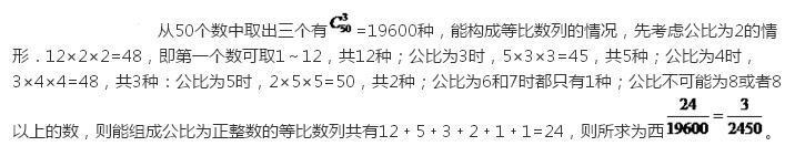 在1~50这50个自然数中,任取三个不同的数,其中能组成公比为正整数的等比数列的概率是:A.3/2450 B.13/2450 C.13/4900 D...