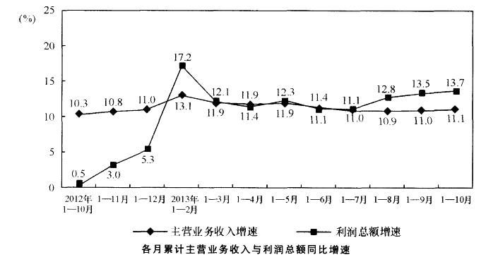2013年1一10月份,全国规模以上工业企业实现利润总额46263.2亿元,比上年同期增长13.7%,增速比1-9月份提高0.2个百分点,其中,主营活动利...